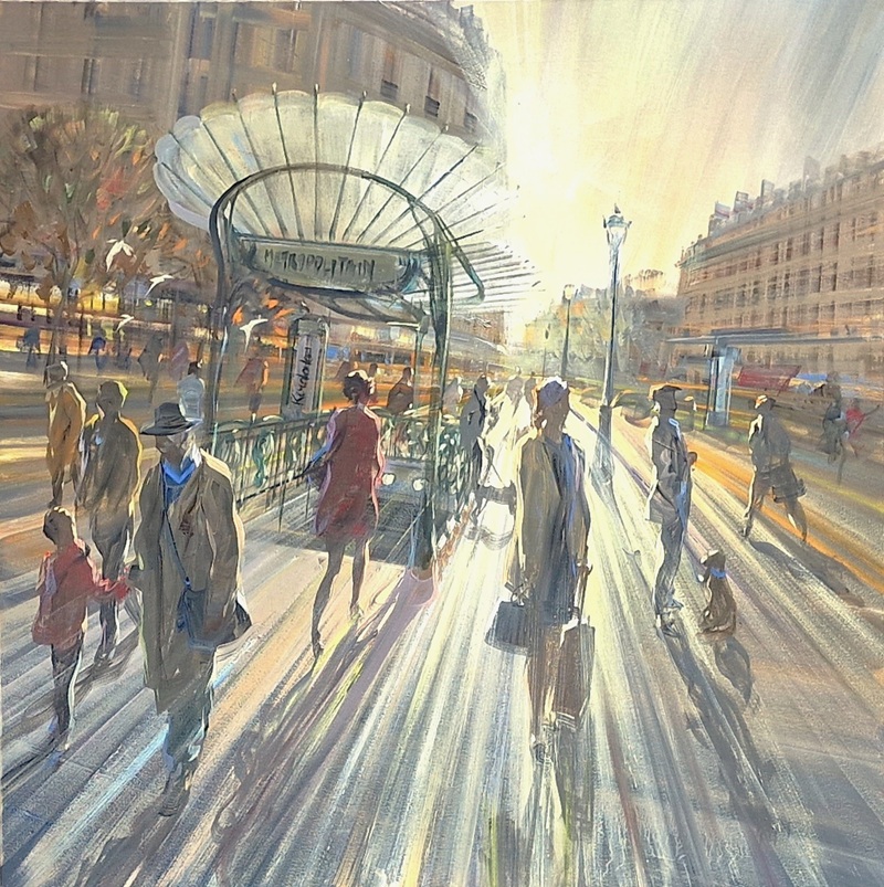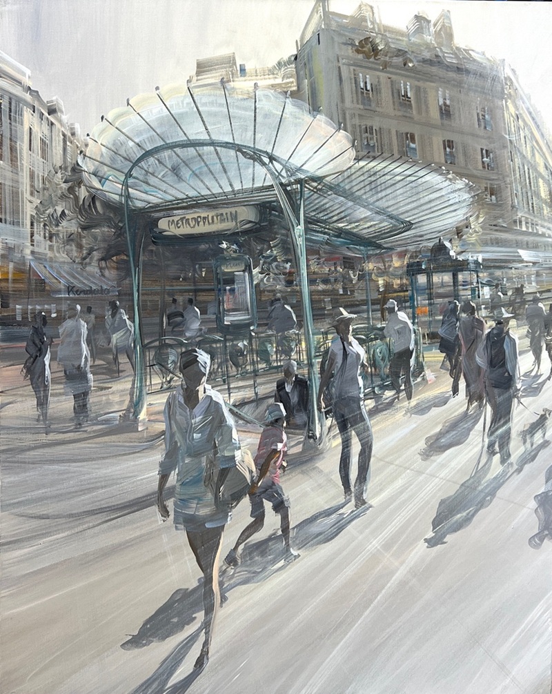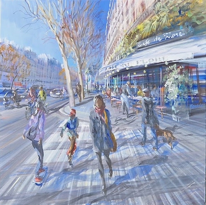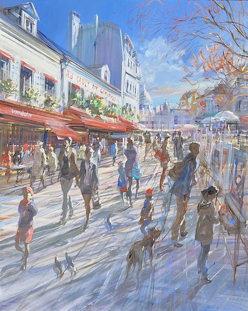 Even if this occasionally creates the impression of a still image, anything static or frozen is avoided: everything is in motion and represents, in fragments, the constant flow of urban life. His paintings are also an optimistic vision of the city of Paris, which he composes from light, strollers, markets, cafés, and terraces, in all its constantly changing character. The viewer is thus drawn into the vortex of a sun-drenched, transcending urban cosmos that evokes consistently positive emotions, and from which it is difficult to escape.