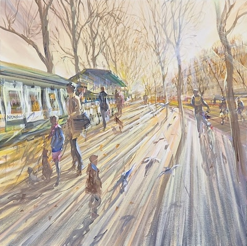 Kerdalo’s view of the city – mostly Paris – is not characterized by descriptive distance, but rather takes the viewer into the midst of sunlit boulevards, which he creates in an impressionistic manner using a gray and sepia palette. The focus of his works is on large avenues captured in central perspective and streets stretching into infinity, but also on the flow of anonymous passersby whose paths cross.