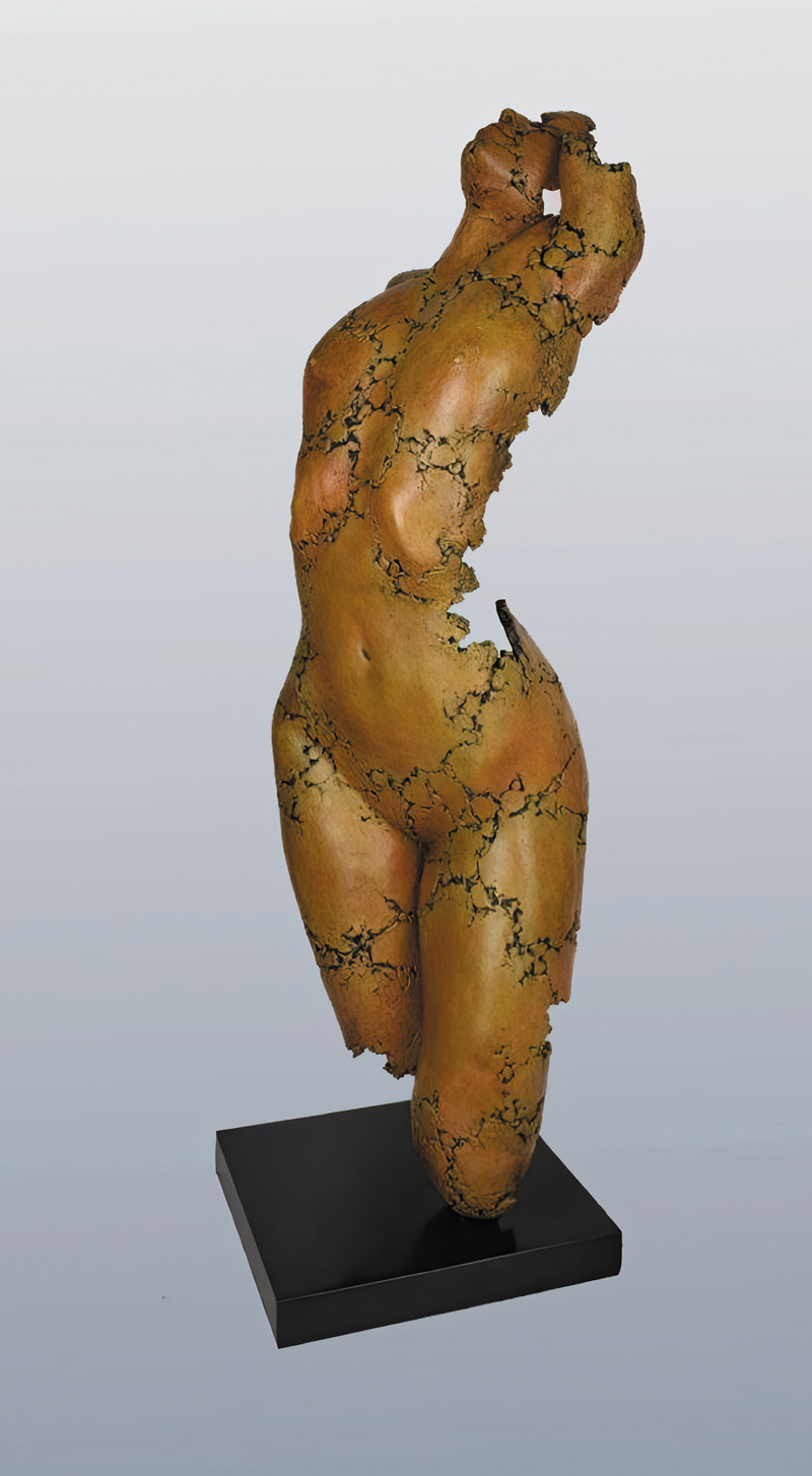 The trademark of the artist, now known for his sculptural works, is the craquelure-covered surface of his bodies and busts. The material — sometimes fired clay, frequently cast bronze — only partially constitutes a fully tangible figuration, appearing almost like a fragmented found object, as is familiar from archaeological excavations. In addition, the material is riddled with deep cracks, which give the whole a seemingly extreme instability, but also a melancholic character, comparable to a memento mori.